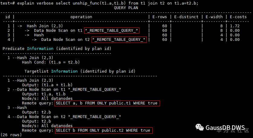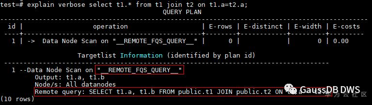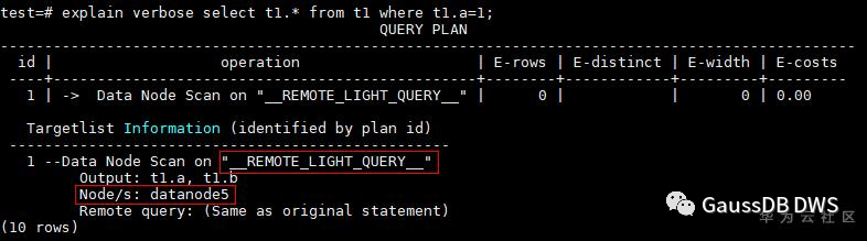 计划解读:因t1.a是表t1的分布列,所以能够匹配上t1.a=1的数据只在某一个DN上,所以这个计划执行相比典型的FQS应该更简单,只在某一个DN上执行即可(例如上面计划所示,只在datanode5执行)。
