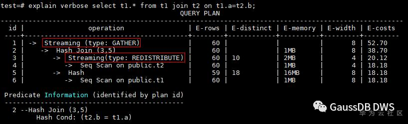计划解读:join条件中t2.b列不是t2的分布列,所以需要对t2表按照a列做REDISTRIBUTE重分布,才能保证每个DN做join时能获取到所需的t1和t2表的对应数据。