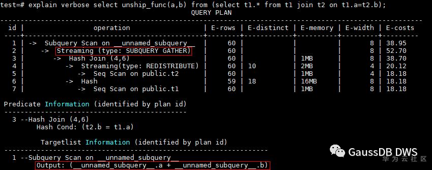 计划解读:unship_func为不能下推的函数,但是from后面的子查询可以下推,这种情况直接把子查询下推到了DN,执行完把数据返回给CN并在CN上调用unship_func计算出最终结果。