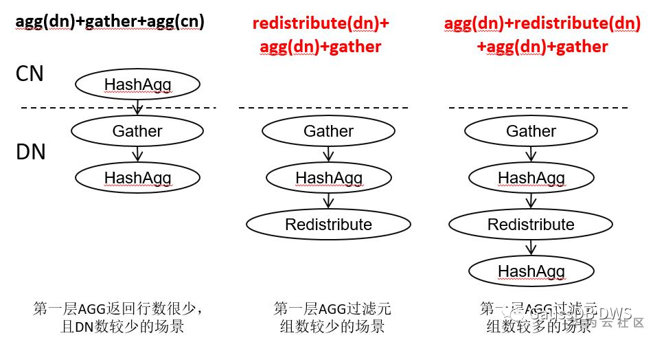 简单点说,先做agg还是先做redistribute主要看先做agg是否能有效过滤数据,从而减少后续redistribute的数据量和传输代价,而在CN做二层agg还是DN做二层agg主要看第一层agg返回的整体数据量多少,因为这决定了Gather(数据从DN->CN)的代价。