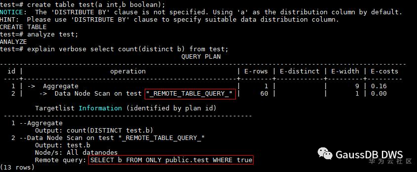 例子中,distinct的b列为bool类型,不能做分布列,所以在DN通过局部的数据无法算出有效的distinct,所以这种场景不能下推,只能是DN把数据返回给CN统一执行,否则最终的计算结果会出现错误。