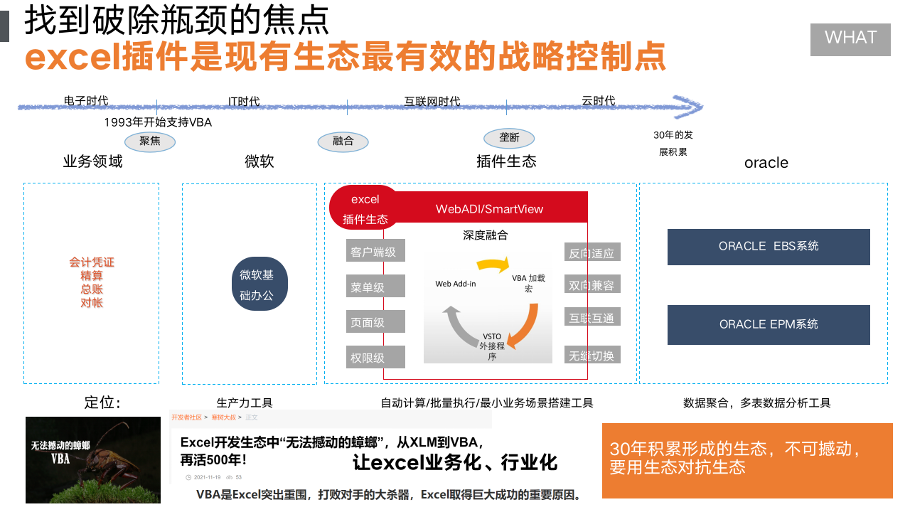 在1993年VBA插件起来的时候,基于流程和管理规则等技术能力,给Excel实现了自动化、批量执行。这就需要在新的市场空间,依赖现有的科技力量,实现降维打击。去赋能新的插件生态。