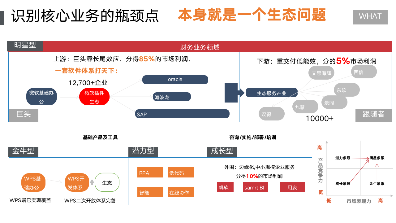 在这个价值主体视角上,寻找产业级蚂蚁市场。由于这么多年,财务人员开发了大量的VBA、表格模板等。但受Excel和ORACLE思维惯性的影响。面向财务人员,基于WPS插件开发的市场,存在巨大的市场空间。