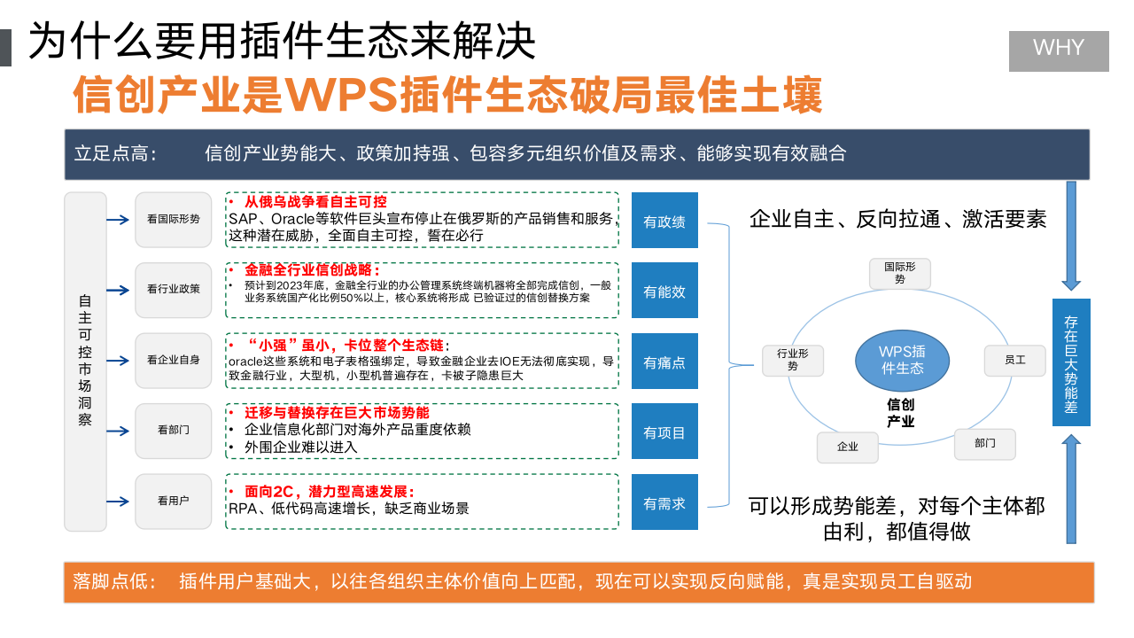 信创产业是WPS插件生态破局最佳土壤。整个产业如果聚焦和定位到插件生态,可以有效实现高立足点的信创产业与低落脚点的面向一线员工实际降本增效的需求,形成有效地拉通,为信创产业形成新的动能。
