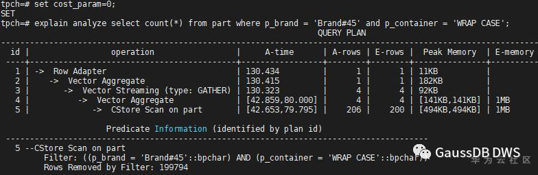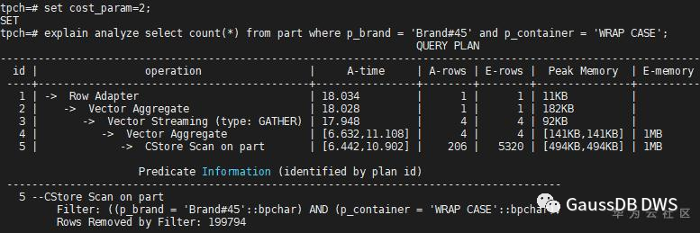 取值 描述 适用场景 cost_param = 0 选择率按乘积方式组合 完全不相关场景 cost_param & 2 != 0 取最小的选择率作为综合选择率 完全相关场景 举一个例子,TPC-H 1x的part表,过滤条件是:p_brand = 'Brand#45' and p_container = 'WRAP CASE',查看不同cost_param下的过滤后行数。 (1)cost_param=0