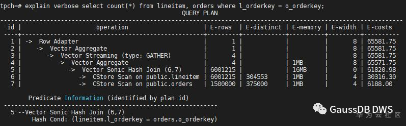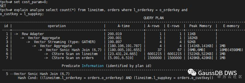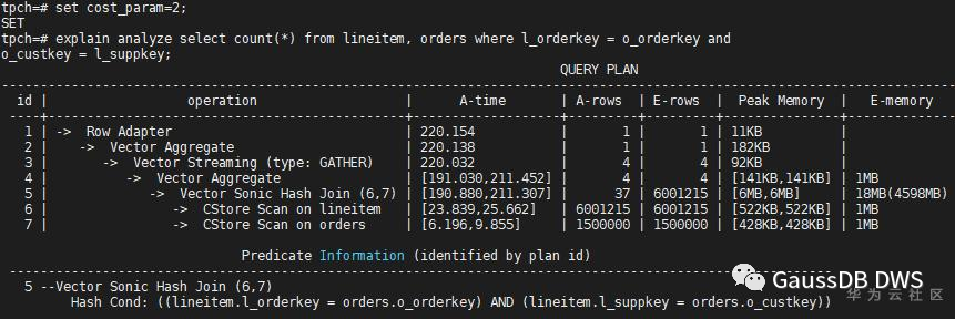此例中,Join的列之间也适合完全相关模型,这与l_orderkey和l_suppkey的分布是吻合的。 由于TPC-H的模型接近完全不相关模型,因此cost_param=0模型可以较好的描述场景,实际应用中,用户可以根据具体业务场景来调整模型,行数估算的准确性是计划生成的重要保证,在调优中检查估算的最直接的地方。GaussDB会在后续版本中新增更多的模型供业务需求选择。