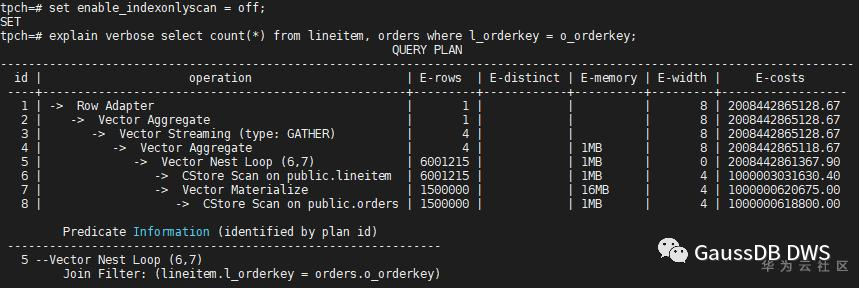 lineitem的扫描变成了Index Only Scan(因为l_orderkey的类型是int),而在orders表上仍然选择Seq Scan(因为没有其他路径),同时关联方式也变为了Nest Loop,因为Hash Join需要全表扫描数据(lineitem的Seq Scan已经被关掉了)。优化器的选择方式我们从代价(E-costs)一栏中也可以看出。再把Index Only Scan关掉,看看计划如何变化:
