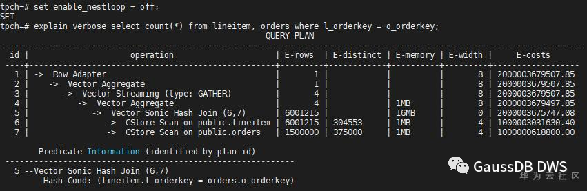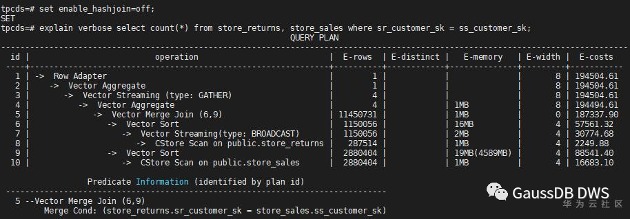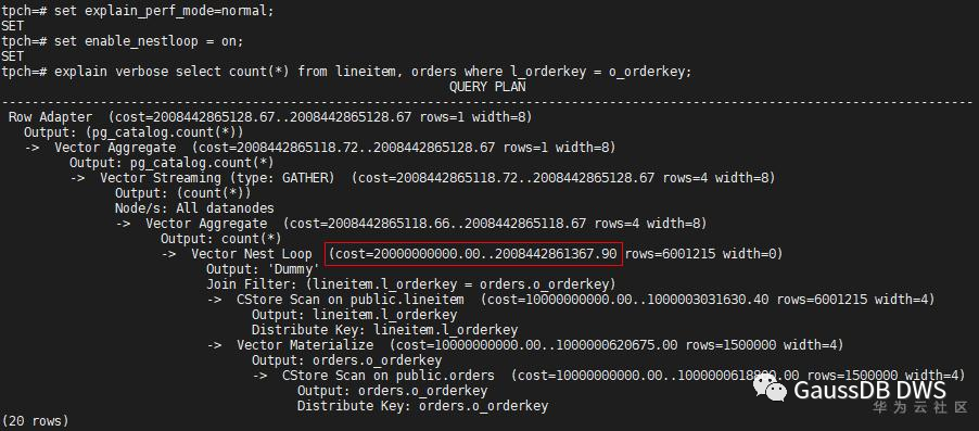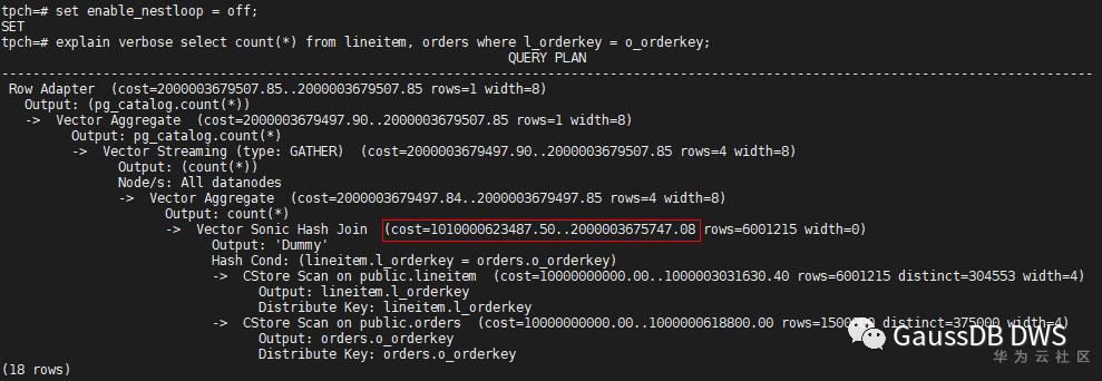 如果再把Merge Join路径关掉,可能就会选择Nest Loop路径。关联方式的控制开关一般用于调优或规避问题,但具体是否能够起作用要看具体的语句,除了当前关联方式,还有没有其他方式。实际场景中,一个语句中关联的算子较多,一般很难用参数enable_hashjoin或enable_nestloop或enable_mergejoin来控制某两个表的Join方式,GaussDB中更细致的语句级别的调优手段是Plan Hint,感兴趣的读者可以参考产品手册。