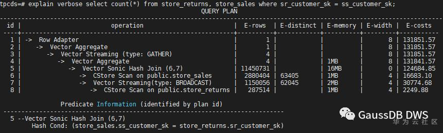 由于两个表的分布键都不是Join Key,因此走Hash Join路径的话需要有一个表做Broadcast或者两个表都做Redistribute,但是store_sales表比较大(E-rows显示28.7亿行),而sr_tbl表行数估算比较少(E-rows显示100行),优化器认为适合做Broadcast。于是最终选择了一边Broadcast的计划。