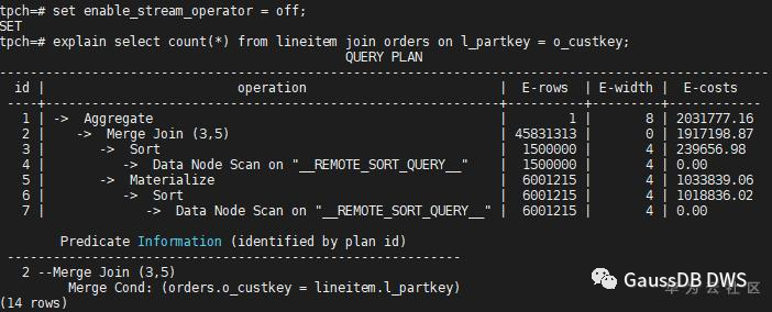 Stream算子是GaussDB分布式执行的关键算子之一,主要起到网络传输的作用,概要介绍可以参考:GaussDB(DWS)性能调优系列实战篇一:十八般武艺之总体调优策略Stream算子由参数enable_stream_operator控制,如果关掉Stream算子,则可能导致生成不下推的计划,例如: