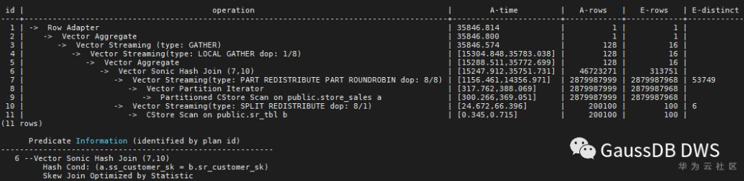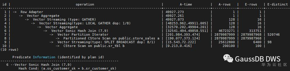我们考虑两个表的简单关联,store_sales和sr_tbl,它们的分布键分别是ss_item_sk 和sr_returned_date_sk,Join 条件是store_sales.ss_customer_sk =sr_tbl. sr_customer_sk,执行结果如下: