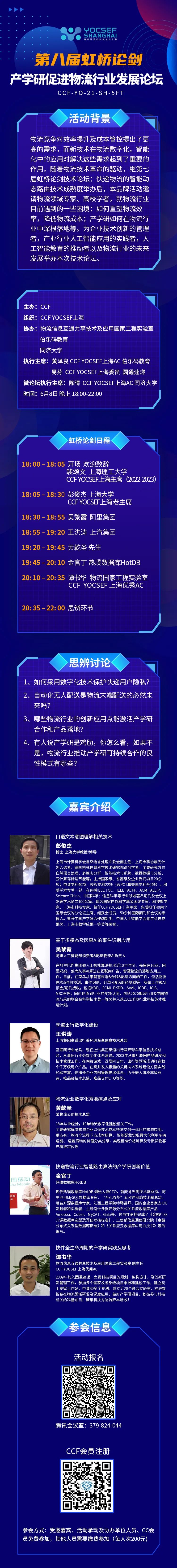 由CCF主办,CCF YOCSEF上海组织,物流信息互通共享技术及营业国家工程实验室、伯乐码教育、同济大学协办的第八届虹桥论剑产学研促进物流行业发展论坛,将于6月8日晚18:00-22:00线上举办,会议地址:腾讯会议室379-824-044。