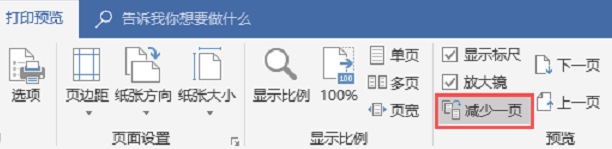 在打印预览编辑模式中,单击"减少一页",