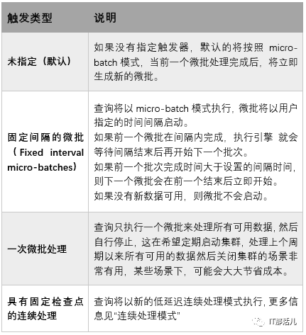 流式查询的触发器的设置定义了流数据处理的时间,无论查询时作为微批处理还是作为连续查询执行。
