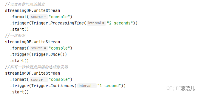 如果要在连续处理模式下执行查询,只需要定义一个连续触发器,并将检查点间隔作为参数。