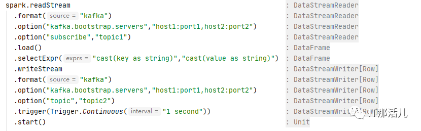 虽然控制台接收器适合测试,但最好使用Kafka作为源和接收器来观察端到端的低延迟处理,因为这允许引擎在输入主题中的输入数据可用的毫秒内处理数据并在输出主题中提供结果。