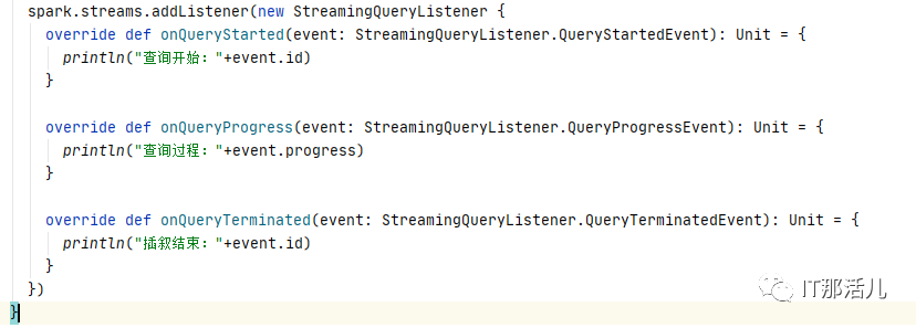 您还可以通过附加StreamingQueryListener(Scala/Java文档)异步监视与SparkSession关联的所有查询。使用sparkSession.streams.attachListener()附加自定义StreamingQueryListener对象后,当查询启动和停止以及在活动查询中取得进展时,将收到回调。