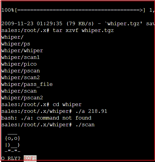 通过 Demo 中的 kippo 捕捉到的log的回放,我们了解到 kippo 生成了一个独立的假的文件系统,入侵者可以在这个假的文件系统中生成文件、下载工具。黑客的所有活动都会被记录,当黑客解压下载的黑客工具开始执行时才发现被愚弄了,下载下来的文件不能执行,每次执行都会出现一个字符组成的提示: