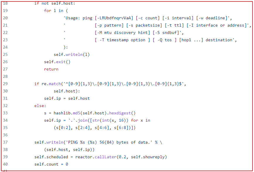 kippo是用python开发的,它足够简单,从代码实现上看,它用python模拟了一个系统,入侵者在里面执行的所有命令都是假的,这些命令都是kippo模拟的,包括 ping 命令: