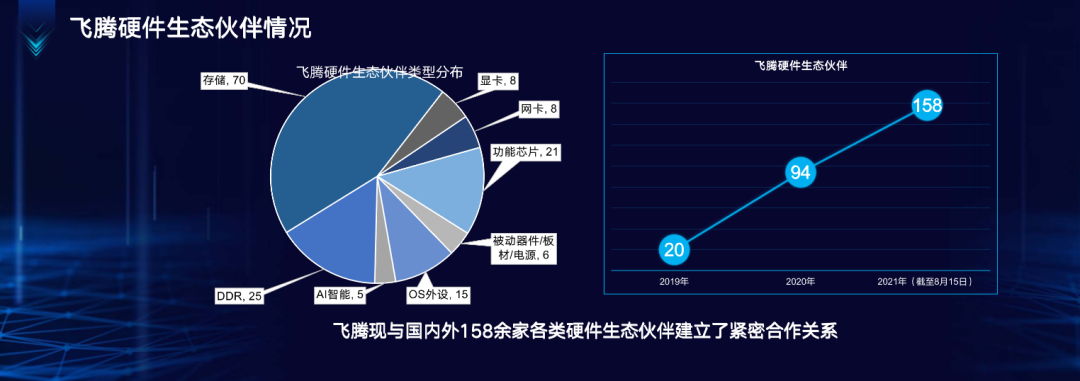飞腾硬件生态伙伴类型分为存储、DDR、显卡、网卡、功能芯片、AI智能、被动器件/板材/电源以及OS外设。飞腾公司技术支持部高级总监陈才介绍,目前,飞腾已经与国内超过158家硬件生态伙伴建立了紧密的合作关系。这是在2019年生态伙伴仅20家,2020年发展到94家之后,实现地更快成长,并且这一数量还在持续增加。