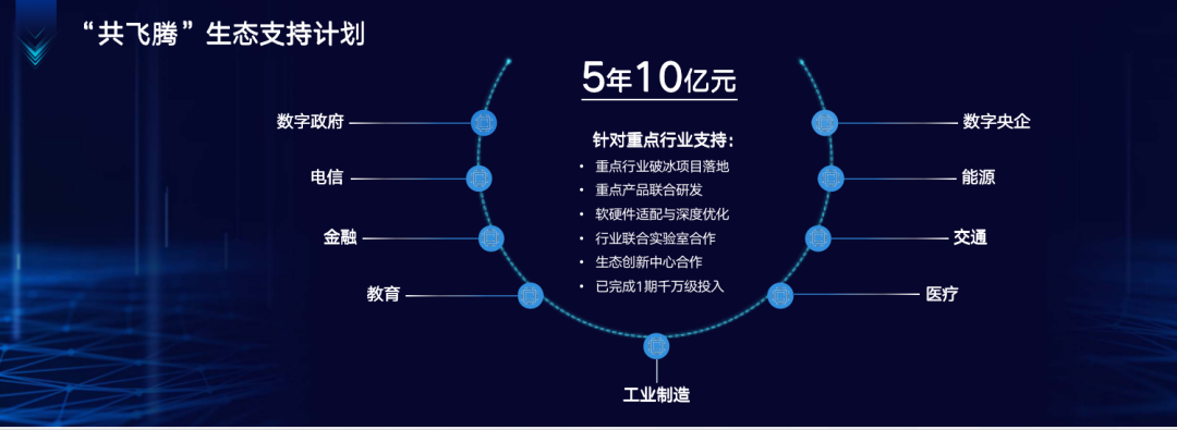 飞腾计划通过“共飞腾”生态支持计划,在5年内投入10亿元支持重点行业破冰项目落地、重点产品联合研发、软硬件适配与深度优化、行业联合实验室合作与生态创新中心合作等,2020年上半年该项目已完成第1期的千万级投入。
