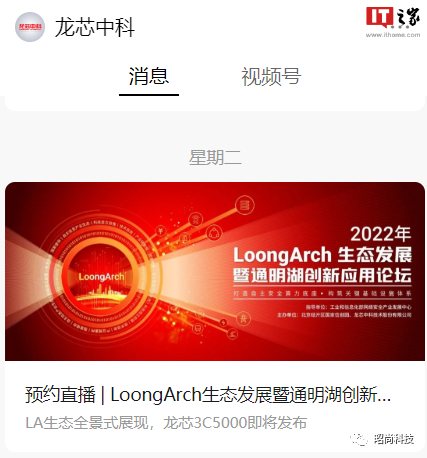 2022 年 LoongArch 生态发展暨通明湖创新应用论坛将于 6 月 6 日 14:00 举行,届时将发布龙芯 3C5000 CPU,以及新一代服务器基础软硬件平台。
