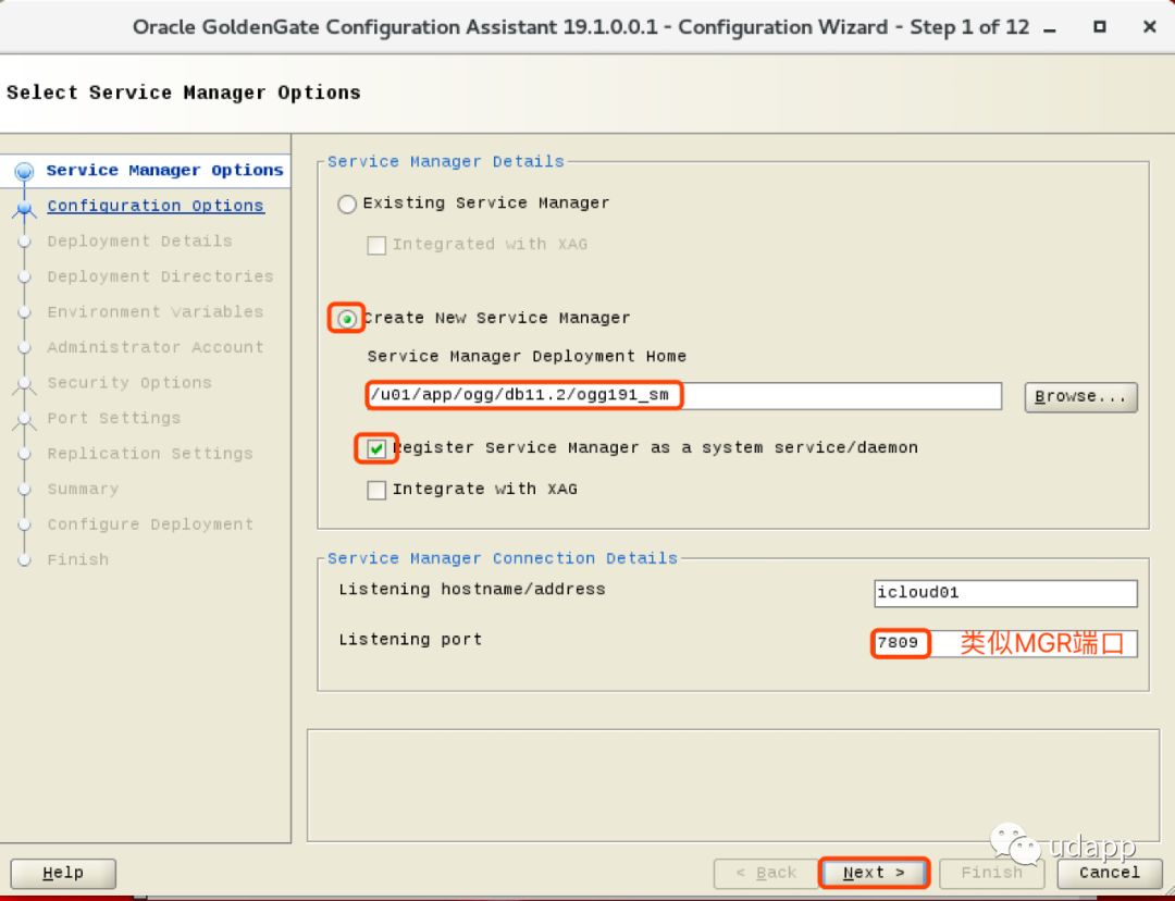 2.1 选择新创建服务管理且勾选注册成系统服务,根据输入sm路径/u01/app/ogg/db11.2/ogg191_ma.其中xag与rac结合的一个插件来管理ogg,本次没有使用,所以没有勾选