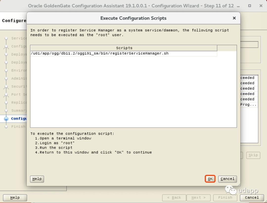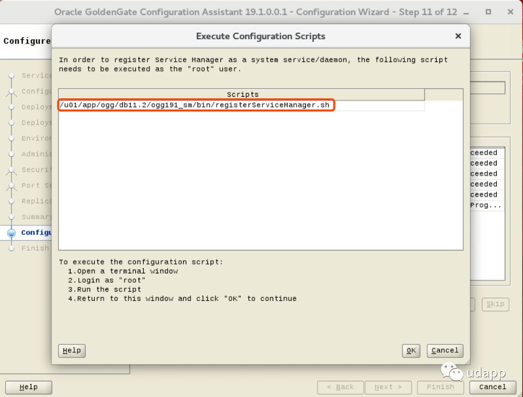 [root@icloud01 u01]# /u01/app/ogg/db11.2/ogg191_sm/bin/registerServiceManager.shCopyright (c) 2017, Oracle and/or its affiliates. All rights reserved.----------------------------------------------------Oracle GoldenGate Install As Service Script----------------------------------------------------OGG_HOME=/u01/app/ogg/db11.2/ogg191_maOGG_CONF_HOME=/u01/app/ogg/db11.2/ogg191_sm/etc/confOGG_VAR_HOME=/u01/app/ogg/db11.2/ogg191_sm/varOGG_USER=oracleRunning OracleGoldenGateInstall.sh...Created symlink from /etc/systemd/system/multi-user.target.wants/OracleGoldenGate.service to /etc/systemd/system/OracleGoldenGate.service.[root@icloud01 u01]#
