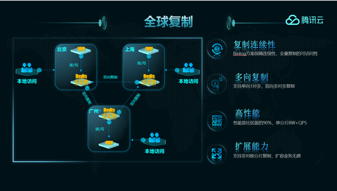 面对上述Redis在异地多活场景中的难题,腾讯云Redis推出了全球复制功能,解决了Redis原生复制不可靠的问题,同时支持多点写入功能,并在数据库层面解决了Redis多地同步且性能不降级的难题,让企业更加专注于业务迭代,满足了企业在多地部署中的就近访问、就近写入以及跨地域容灾的需求。