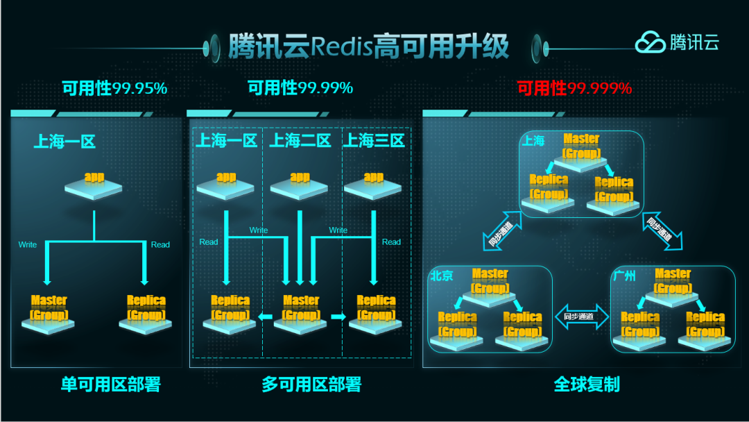 在可用性上,腾讯云Redis全球复制功能提供高可用性承诺。具体而言,相对现有的单可用区部署3个9(99.95%)的可用性承诺,对多可用区部署的Redis实例提供4个9(99.99%)的可用性承诺,对使用全球复制进行跨可用区+跨地域部署的Redis实例提供5个9(99.999%)的可用性承诺,满足企业在不同业务场景中对Redis可用性的诉求。