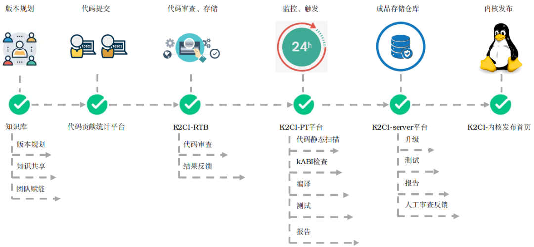 麒麟软件研发人员通过调研CI/CD的工具链,以及针对内核自动化持续集成的研发,构建了麒麟软件自有的K2CI平台,它的主要业务流包括集成代码审查、代码静态扫描、编译、测试、反馈、发布等。自动化作为CI的基石,麒麟软件K2CI平台通过自动定时触发检测、自动代码静态扫描、自动kABI检查、补丁实时集成及自动编译、测试、报告、定位、创建任务、关闭任务等全自动功能更好的为研发人员提供了稳定的服务,全方位守护内核质量,实现了持续稳定的产出。