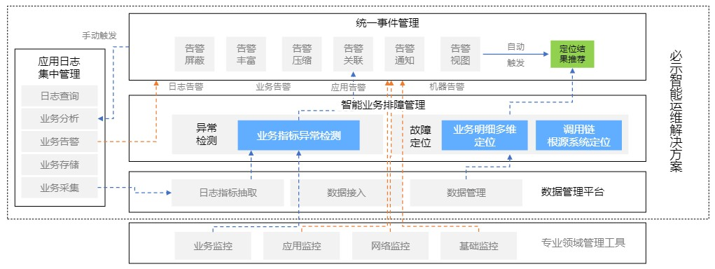 必示智能运维解决方案集中纳管已有的各类运维数据,包括业务指标数据、机器指标数据、各类监控工具的告警数据,通过数据汇聚、标准化、关联、计算、查询等数据处理功能实现数据统一治理和对外提供数据服务,并进一步构建业务指标异常检测、业务明细多维定位、机器指标定位、调用链根源系统定位和指标趋势预测五大核心场景,建立涵盖数据管理、故障发现、故障定位和故障预警的综合运维体系。