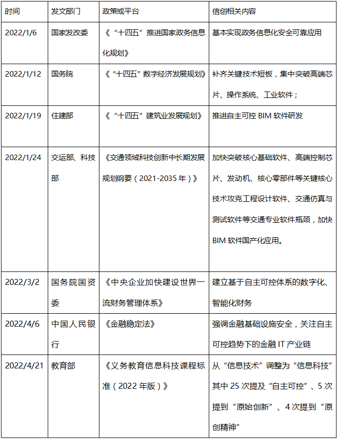 2021年,信创政策持续落地,2022年,基础软硬件国产化的要求更是密集出现在多项重大政策中,政策颁布节奏明显加快。从党政到重要行业,从小范围试点再到全行业铺开,相关政策陆续颁布,覆盖范围逐步扩大。政策力度的加大,范围的扩大让我们更坚定地相信我们国家未来的信息安全将得到保障,不再遭受到国外“卡脖子”的困境。