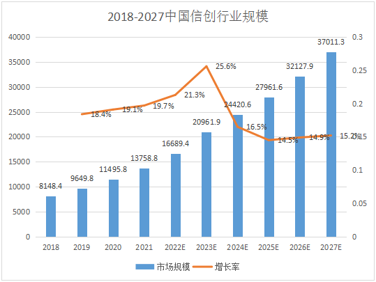 随着中国数字经济规模不断扩大,企业纷纷加入数字化转型队列,在国家发展信创的战略背景下,信创行业将蓬勃发展。数据显示,2021年中国数字经济规模已达47.6万亿元,占GDP比重为43.5%。得益于中国数字经济的迅猛发展,2021年中国信创产业规模达13758.8亿元,2027年有望达到37011.3亿元,中国信创市场释放出前所未有的活力。