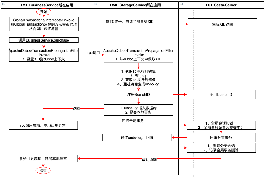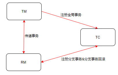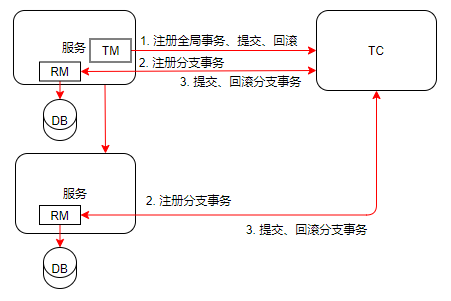三个组件相互协作,TC 以 Server 形式独立部署,TM和RM集成在应用中启动,其整体交互如下:
