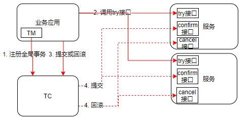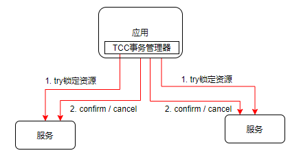 TCC:try/confirm/cancel,在try阶段锁定资源,confirm阶段进行提交,资源锁定失败执行cancel阶段释放资源。