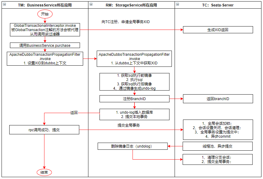下图中,步骤1开启全局事务;步骤2注册分支事务,这里对应着一阶段;步骤3提交或者回滚分支事务,对应着二阶段。