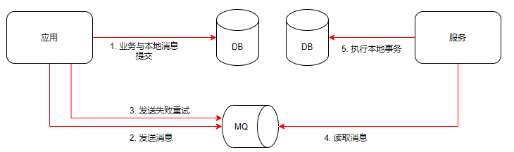 本地消息表:跟MQ事务消息类似,区别在于MQ不支持事务消息,需要借助本地数据库的事务管理能力。在步骤1中将需要发送的消息和本地事务一起提交到DB,借助DB的事务管理确保消息持久化。步骤2应用通过本地消息表扫描,重试发送,确保消息可以发送成功。
