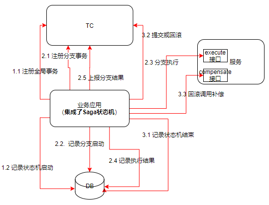 上图中对于多个分支事务,省略了多次出现的 2.* 步骤。对于全局事务执行过程中业务应用宕机情况,业务应用集群中对等节点会通过从TC获取相关会话,从DB加载详细信息来恢复状态机。
