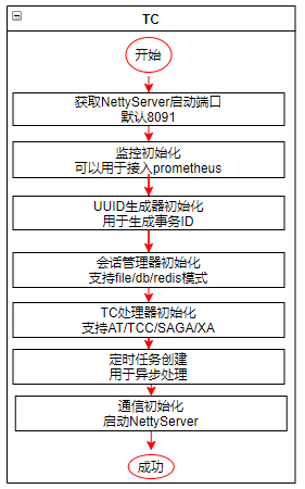 TC(事务协调器)以独立的服务启动,作为Server,维护全局事务和分支事务的状态,驱动全局事务提交或回滚。下面是TC的启动流程: