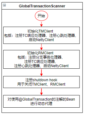 TM所在应用中需要配置GlobalTransactionScannerbean,在应用启动时会进行如下初始化流程: