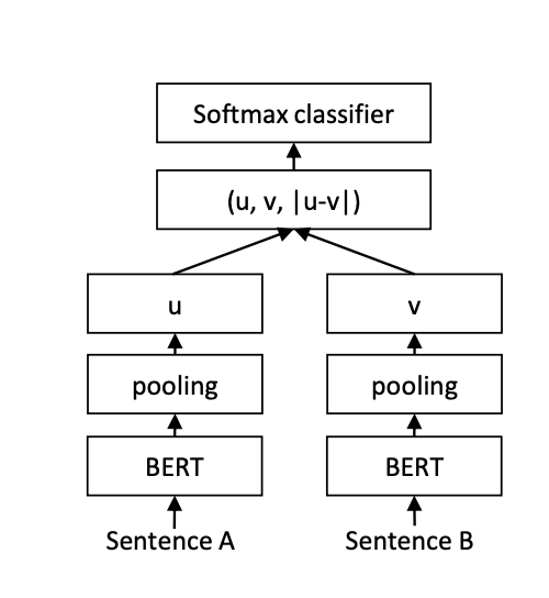 问答服务最早采用的模型是 SBERT(Sentence Embeddings using Siamese BERT) 模型(1),也是业内普遍使用的模型。其模型结构如下所示: