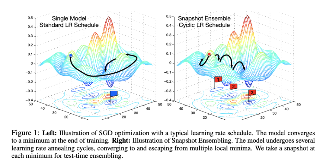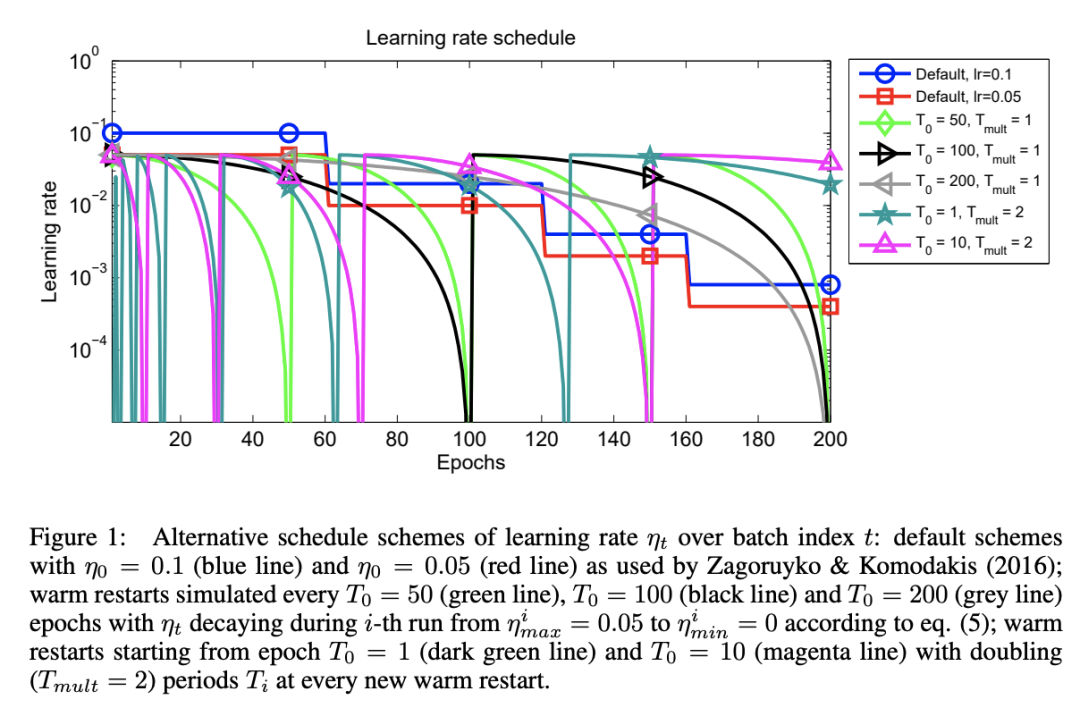 余弦退火学习率通过缓慢下降+突然增大的方法,在模型即将到达局部最优的时候,可以“逃离”局部最优空间,并且进一步检索到更好的局部最优解。下图源自 CosineAnnealingLR 的 paper,其中 default 是 StepLR 的衰减,其他则为余弦周期性衰减,并在衰减为 0 时恢复最大值。