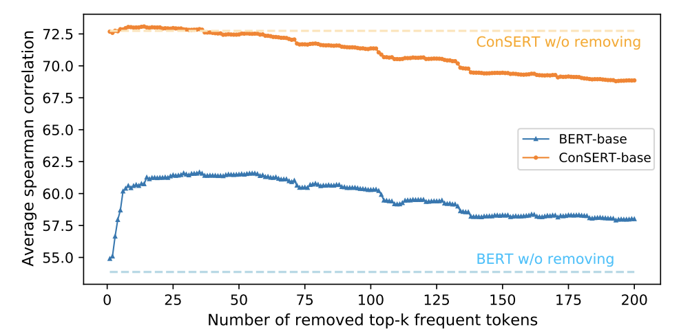 高频的词汇严重影响了 BERT 中句子的 embedding,少量的高频词汇决定了 embedding 的分布,导致 BERT 模型的表达能力变差,Contrastive Learning 可以消除此影响。根据论文 ConSERT(10)的实验,证明了高频词确实会严重影响 embedding 的表达,如图所示: