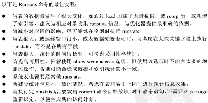 关于最后一条:在成功执行RUNSTATS命令之后,静态SQL查询并不会使用最新的数据库统计信息,这是因为静态SQL的访问策略在之前执行BIND时就已确定,而当时使用的统计信息有可能与现在的并不一致。这时候就需要重新绑定使用静态SQL的应用程序,这样查询优化器就可以根据数据库最新统计信息来选择获取数据的最佳访问策略。但是,对于使用动态SQL的应用程序而言,则没必要重新进行重新绑定,因为动态SQL语句的访问策略是根据统计信息在运行时动态生成的。