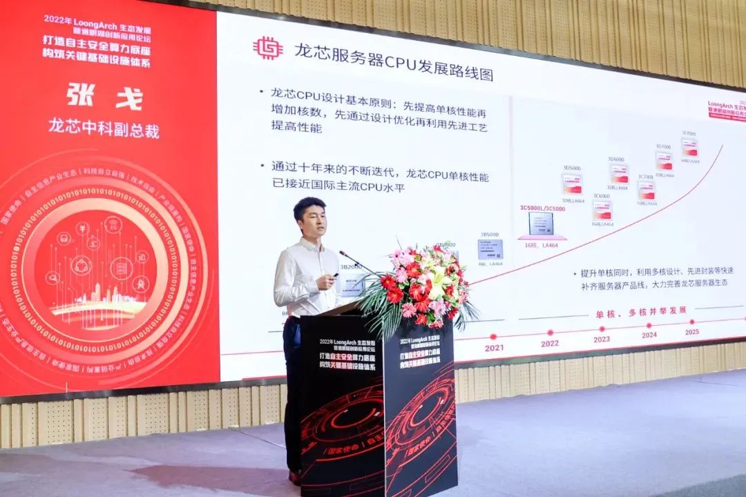 2022年6月6日,由工业和信息化部网络安全产业发展中心指导,北京经开区国家信创园和龙芯中科联合主办的“2022年LoongArch生态发展暨通明湖创新应用论坛”在线上召开。会上,龙芯重磅发布了龙芯3C5000服务器处理器,并联合生态伙伴共同发布新一代国产服务器基础软硬件平台。