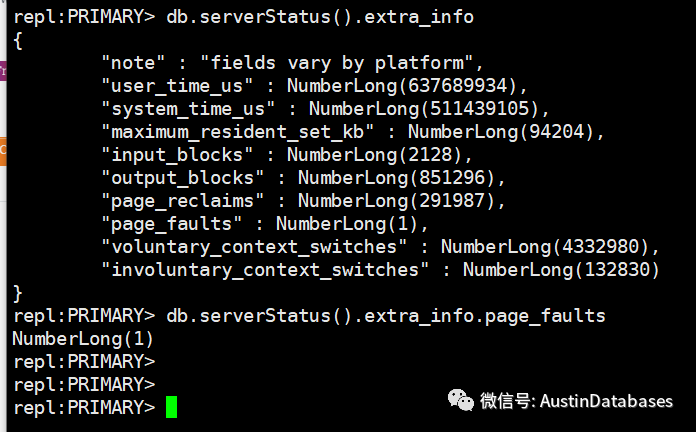 db.serverStatus().extra_info.page_faults , 也可以通过extra_info命令来获取系统内告知的 page_faults的数量。