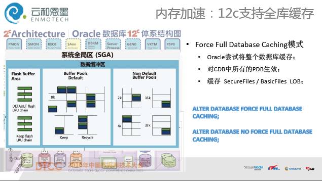 当你的内存足够大之后,甲骨文12C支持一个特性叫做全库缓存,可以通过一条命令缓存整个数据库。