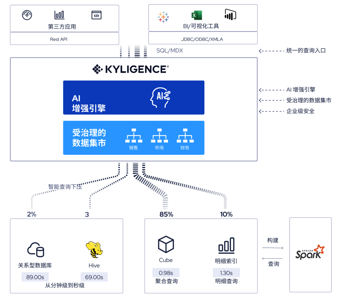 首先,我相信性能和成本是很多客户在选型时会考虑的重要因素。Kyligence 的智能多维数据库产品及解决方案使用云原生、分布式等技术,通过空间换时间的方式支持高性能的 OLAP 计算,并能适应任何形态的数据湖,以一种成本最优的方式为上层分析应用提供高性能的查询能力。