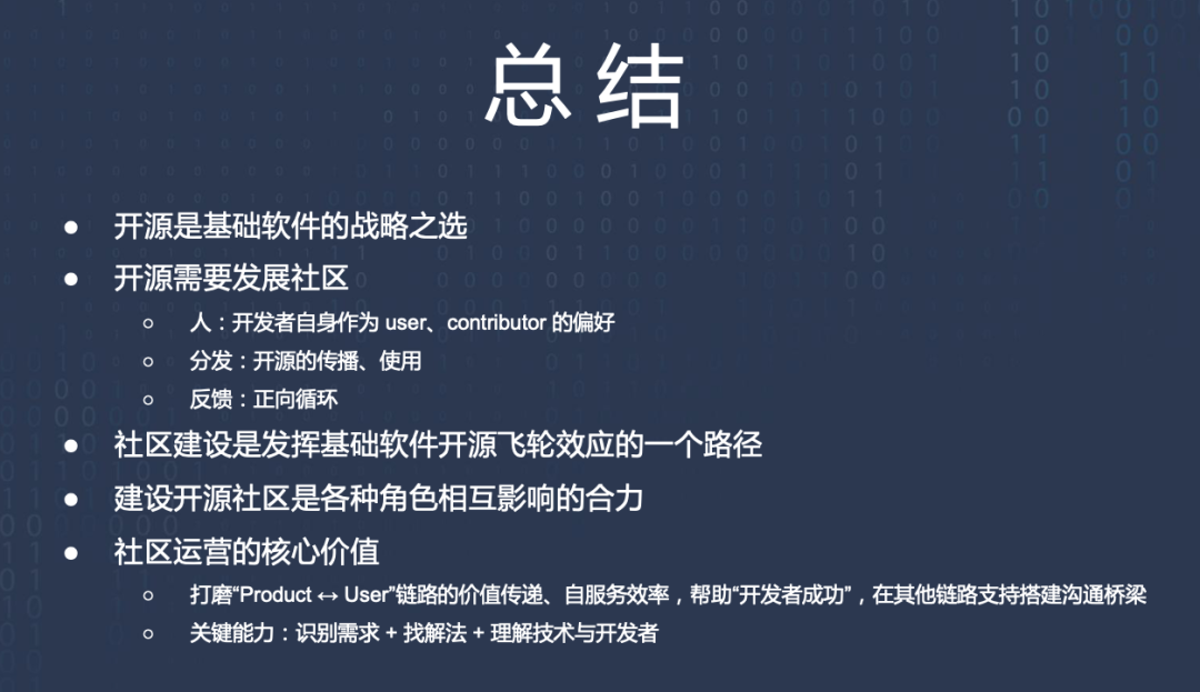 开源本身是个很丰富的概念,如果简化来看,我尝试总结为三个关键词:第一个是理想,是用技术进行创造的一种内生驱动因素;第二个是协作,特别是开源作为一种协作开发的方式,有其规则和理念,这些让素不相识的一群人能够一起创造;第三个是真诚,虽然看起来虽然普通,但也是一切的基础,开源社区的建设,是一个长期的信任关系的构建,离开真诚,信任无从谈起。